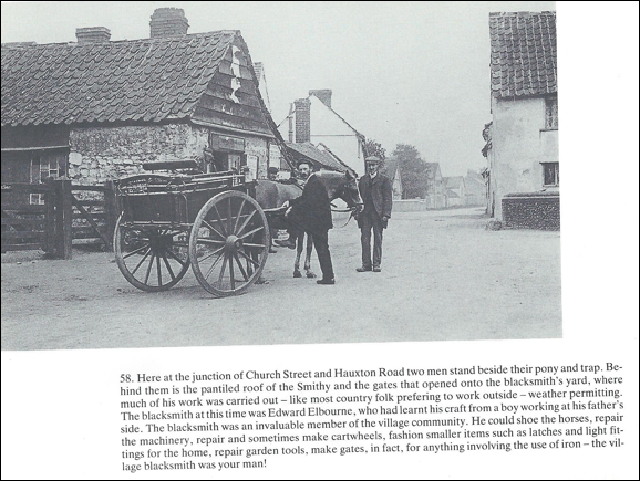 The Blacksmith shop sits on the left. Edward Elbourne is tending the horse.