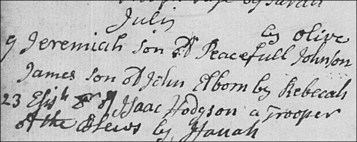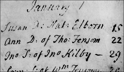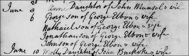 1699 -- Nathaniel Elborne christened dau. Elyzabeth on 30 Aug 1699 in Bovingdon, Hertfordshire, England.
