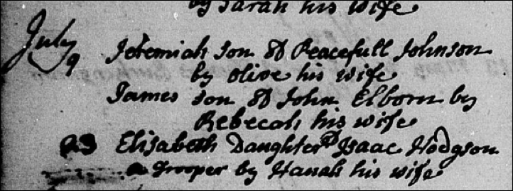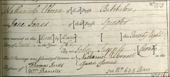 Banns record of ÒaÓ Nathaniel ÒElborneÓ marrying Jane Jones on 28 Jun 1762 in Holborn St. Sepulchre parish in London, England. There are multiple records of multiple women named Jane Jones born ca. 1740 in London.