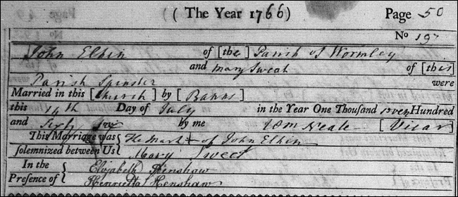 Elizabeth Elborn, born 22 Jan 1757 in Aldenham, Hertfordshire, England, dau. of Joseph and Elizabeth Elborn.