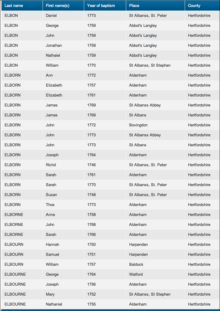 2.1 Susan Elborn on 15 Jan 1748 in Saint Peter, Saint Albans, Hertfordshire, England. MotherÕs name is not listed, but father is listed as Nathaniel.