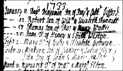 Margaret Elbon, daughter of William and Margaret Elbon, b. 11 Mar 1732/33 in Wyke Regis, Dorset, England.