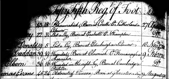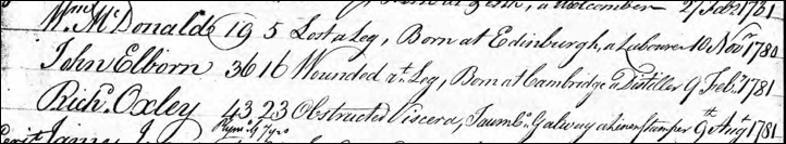 1745 – John Elborn, who was born in 1745 in Cambridge, England, a Distiller, enlisted in the 55th Regiment of Foot in Canada, was wounded at the leg, age 36 at his administration date of 9 Feb 1781. He appears in the UK Royal Hospital Chelsea Pensioner Registers of Soldiers Who Served in Canada, 1743-1882, but after his duty as a British soldier, he does not appear in the Royal Hospital in Chelsea London itself. The only John Elborn Foot Guards are senior infantry regiments.