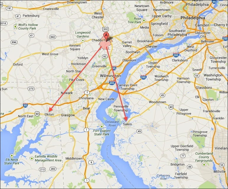 40–50 miles (60–80 km) southwest of Philadelphia.