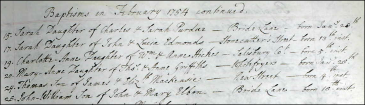ÒAÓ John William ÒElbonÓ was baptized on 26 Feb 1754 at St. BrideÕs Parish, Fleet St., London, the son of John and Mary Elbon. The date is a possibility, the place is also a possibility for immigrating to Maryland, and the name Mary is what John named his first daughter. Furthermore, the death date states 1828; the John Elbin of Maryland died right before the 1830 census. Absolutely no validity has been determined to connect this John in London with the John Elbin in Allegany Co., MD, and Bedford Co., PA.