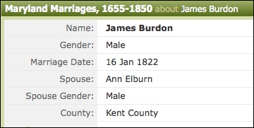 1822 Jan 16 -- James Burdon and Ann Elburn married in Kent Co., MD. The name has been spelled as Burdon, Burden, Burton, and Burten.