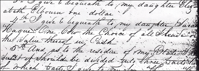 Elizabeth Hague was the daughter of William Hynson Hague (1774-1834) and Hester Williamson (1780). She was born 6 Jan 1805 in Maryland and died 16 Jan 1873 in Wabash Co., IN, at age 68 years and 10 days. Her father wrote his will on 25 Mar 1832 in Kent Co., MD, which might indicate that Elizabeth had not yet moved to Indiana, but she appears in Indiana in the 1840 census. William Hague gives to his wife Hester, to his daughter Johanna Lazenby, to his daughter Elizabeth ÒElbournÓ, and to his daughter Sarah Hague. Because the signature part of his will is cut off, we donÕt know if he signed his name or made his mark with an ÒXÓ, but in any case, the name ÒElbournÓ is clearly spelled as such. The will was proved 18 Jun 1834.