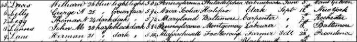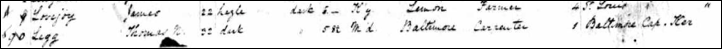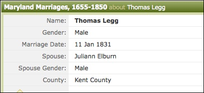 Thomas Legg Jr. is listed in the 1850 census, age 22, born 1828 in MD, living in 1850 in District 2, Kent, MD, with James W. Greenwood, age 28, and Mary Iriford, age 40. The 1850 census is notorious for incorrect ages.