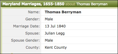 1840 Jul 13 -- Juliann m2. Thomas Berryman on 13 Jul 1840 in Kent Co., MD.