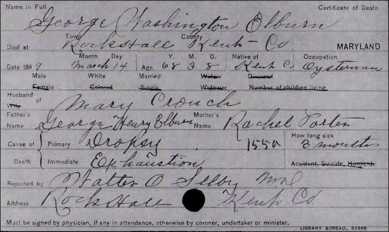 1899 Mar 14 -- This document is the only one found so far with any information on it about George Henry Elburn, his wife Rachel Porter, and their son George Washington Elburn. Dropsy is an old term for edema, which is a condition characterized by an excess of watery fluid collecting in the cavities or tissues of the body. Using the Date Calculator, George Washington Elburn died on 14 Mar 1899 at 68 years 3 months and 8 days, which calculates to Monday, December 6, 1830. He had m1. Mary Crouch and m2. Mary Beck – perhaps the informant made a mistake with the surname as George was married at his death and he was married to Mary Beck.