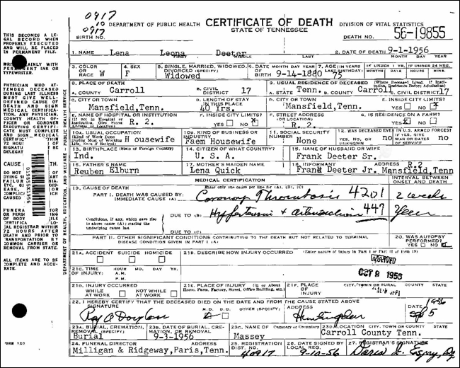 6.7 Leona Elborn, b. 14 Sep 1880 in IN, m. Frank J. Deter/Deeter. Frank was born 3 Jan 1875 in IN, son of Elizabeth Deeter. In the 1900 census of Noble, Wabash Co., IN, he was 25 years old and single. In the 1910 census of Paw Paw, Wabash Co., IN, he was 35 and married to Levina/Edith who was 29 years old. In the 1920 census of Civil District 17, Carroll Co., TN, she was age 37 and married with 6 children. In the 1930 census of District 17, Carroll Co., TN, she was living with her husband Frank and 3 children. She died on 1 Sep 1956 in Mansfield, Carroll Co., TN, the daughter of Reuben Elburn and Lena Quick. Frank Deeter signed up for the WWI Draft in Carroll Co., TN.
