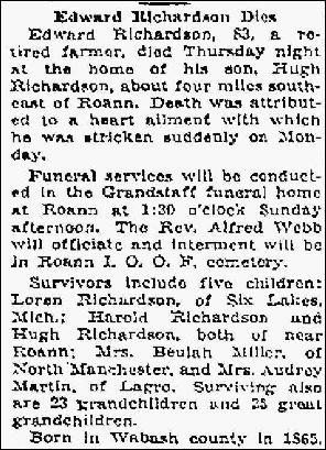 Cora d. 17 Mar 1959 in Wabash Co., IN. Cora and Edward are buried at the Roann Community Cemetery in Roann. They had children Loren Grover Richardson, Hugh Elden Richardson, Beulah B. Richardson, Audrey L. Richardson, Harold Richardson, and an unnamed son.
