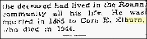 6.13* Wilbur E. Elburn Sr., b. 13 Apr 1887, Miami Co., IN, d. 18 Feb 1939, Mexico, Cass Co., IN. He was a farmhand on the Casebeer Farm near New Waverly. He m. Edith M. Townsend in 1921, and they must have divorced by 1929 as she married WilburÕs half brother William Confer on 6 Sep 1928.