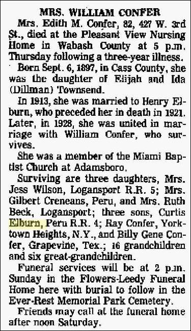 Edith M. Townsend m1. Henry Elburn, m2. Wilbur Elburn, and m3. Henry and WilburÕs half brother William Confer. Edith Confer was b. 16 Sep 1897 and d. Nov 1969 in Peru, Miami Co., IN. She is buried at the Ever Rest Memorial Park, Logansport, Cass Co., IN. In 1947 she was living with William R. Confer at 126 E. 8th St., in Peru, IN.