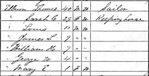 Could it be that the census recorder switched the names of Thomas and Louis, stating that Louis should have been Lemuel who was born in 1830, and Thomas should have been the one listed as age 11 or born in 1859, and that his name was actually James T. Elbourne. The 1860 census (the one before this 1870 census) shows Lemuel b. 1830, his wife Sarah C, age 21 (born in 1839), and James T., age 1.
