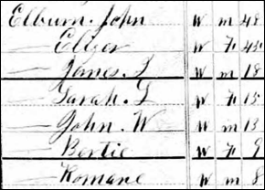 The enumeration date is 14 Jun 1880 at which time James would have been exactly 20, but here it states he is 18. Their neighbors were the Crouch, Benton, and Beck families, all of whom married into the Elburn family.