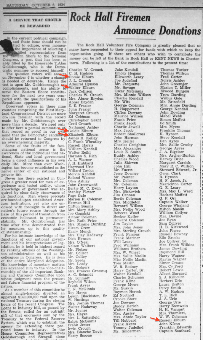 1934 Oct 6 – Romie donated to the Rock Hall Fire Department.