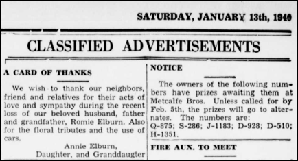 1939 Dec 28 – Romie died. From the Transcript, Chestertown, Maryland, Saturday, January 13th, 1940.