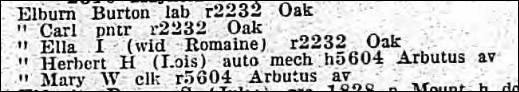 1928 City Directory of Baltimore, MD -- Ella appears in the 1928 City Directory of Baltimore, MD, as the widow of Romaine, living at 2232 Oak, living with some of her children.