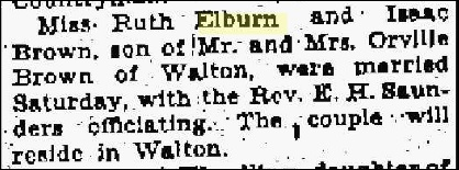7.6 Ruth Arlene Elburn, b. 14 Dec 1922, d. 8 Aug 2001 of diabetics complications (Type II), buried at Memorial Lawns Cemetery, Wabash, Wabash Co., IN. She m. Isaac Brown on Saturday, 30 Jul 1938, lived in Walton, Cass Co., IN. She was in the 1930 census of Jefferson, Miami Co., IN, living with her father Wilbur E., and her grandparents and 2 siblings. In the 1940 census of Tipton, Cass Co., IN, Ruth was 18, married to Isaac Brown 27, and had daughter Beverly Brown 11/12.
