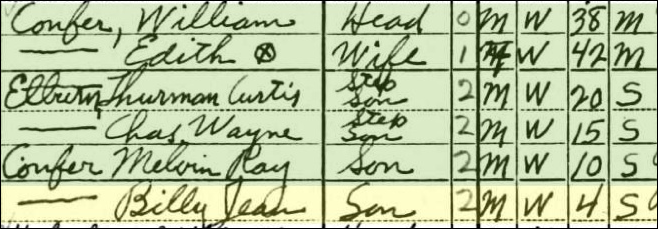 William and Edith Townsend Elburn Confer had 3 children: Melvin Ray Confer, Billy Gene Confer, and Carl Confer. In the 1930 census, where husband #2 and children are living with the Confers, William and Edith Confer along with son Ray (the only child born at this date) and EdithÕs 70-year old uncle, Peter Dillman, are living in Miami, IN. In the 1940 census, William and Edith Confer, Thurman Curtis Elburn (marriage #1), Charles Wayne Elburn (marriage #2), Melvin Ray Confer (marriage #3) and Billy Gene Confer (marriage #3) are also living in Miami, IN. Son Carl Confer was born and died in 1931. When Edith Townsend Elburn Confer died, her obituary only lists 2 husbands, Henry Elburn and William Confer. She does however list a daughter from the second and ignored marriage: Mrs. Ruth Beck is Ruth Arlene Elburn, daughter of Wilbur Elburn. The other 2 children from her second marriage preceded her in death: Wilbur Junior Elburn died in 1942 and Charles Wayne Elburn died in 1963. One of her children from marriage #3 also is omitted from her obituary: Carl Confer who died in 1931.