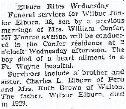 Charles Wayne Elburn is listed in the 1940 census of Peru, Miami Co., IN, age 15, the step-son of William Confer and the son of Edith Townsend Elburn Confer from her marriage to Wilbur Elburn. Furthermore, Thurman Curtis Elburn is in this census as a step-son of William Confer; his parents were Henry Elburn and Edith Townsend Elburn. This is quite an important census record as it definitely proves that Edith Townsend had married 3 brothers: Henry, Wilbur, and William, although William was a half brother; his mother was Minnie M. Smith (same mother as for Wilbur and Henry) but his father was Labon Confer, not Samuel Elburn. At this census, EdithÕs daughter Ruth (by Wilbur) was married and listed in another household, and her son Wilbur Jr. (by Wilbur) was in a deaf institute where he died shortly thereafter. EdithÕs children with Henry Elburn (Lucille, Edna, Thurman) were all older as Henry was her first husband. Edith and William (the third brother who was a half brother because his father was Labon Confer whereas the other sonsÕ father was Samuel Elburn) had 2 more children: Melvin Ray Confer b. 8 May 1929 and Billy Gene Confer b. 10 Jun 1936, both of whom are also in this 1940 census.