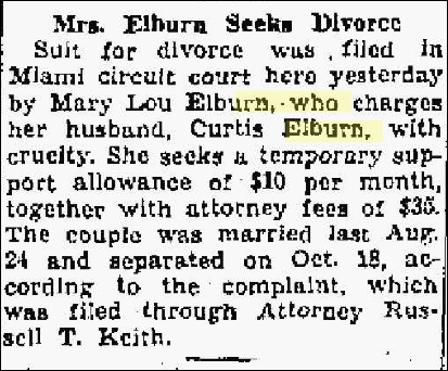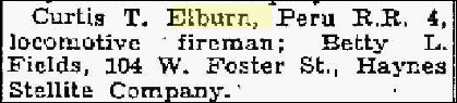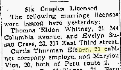 He m1. Wilma Jean and had no children, m2. Mary Lou Vier on August 24, 1940 and separated 2 months later on 18 Oct 1940, and she filed for a divorce on 30 Dec 1940, and had no children, m3. Betty Lou Fields and had heirs. His marriage licenses and divorces are in the Kokomo Tribune. Betty Lou Elburn was b. 29 Jun 1926 and d. 13 May 2000 at age 73 according to the Peru Newspaper Obit Index: http://www.edanddebby.com/peruobits/POIdoem.html.