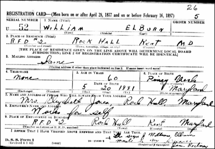 He was living in the 1910 census in Fairlee, Kent Co., MD, 28, with his father and brother Samuel. William Elburn, lived on R.F.D. #2, Rock Hall, age 60 when registered for the WWII Draft, born 20 May 1881 in Piney Neck, MD, signed record by Mrs. Elizabeth Jones of Rock Hall. He was 5Õ 4Ó 135 lbs, blue eyes, gray hair, ruddy complexion. William (49) and Mary E. (46) appear in the 1930 census of Election District 5, Edesville, Rock Hall, MD, with their 9-year old daughter, Mary Elizabeth ÒTippyÓ Elburn, b. 26 Apr 1920 in Kent, MD, and d. 17 Jul 2009 in Chestertown, Kent, MD; William was a waterman engaged in fishing; they were living near Thomas J. Elburn (68) and his wife Rebecca (66), who were descendants of the ÒSamuel ElburnÓ line, probably a brother or cousin of ÒJames ElburnÓ, this line.