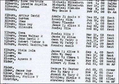 7.41* Burton W. Elburn, b. 13 Jun 1908, Kent, MD, m. Gertrude, b. Abt 1923. (he never had a middle name), b. 13 Jun 1908, Kent, MD, m. Gertrude M. Pekoninsky whose family changed her name to unknown. In the 1910 census of Edesville, Kent Co., MD. Appears in the 1910 census of Edesville, Kent Co., MD. He was living in Baltimore, MD, in the 1928 City Directory, working in a laboratory. He appears in the 1920 census of Kent, Queen AnneÕs Co., MD, the brother of Carl, living with his mother, Ella. In the 1930 census of Baltimore, Baltimore Independent City, MD, he was still living with his mother, Ella, and siblings Aurelia 34, Carl 29, Lemont 16. In the 1940 census of Baltimore, he was living at 2649 Miles Ave., working as an Operator Seaming Machine, married to Gertrude M. Fisher, but Fisher was not her real name — they just pulled it out of a hat as she was Polish and the family wanted to hide their name Pekoninsky. In this 1940 census, Gertrude was 27, and living with their 8 children: Burton W. Elburn 8, William M. Elburn 7, Janet L. Elburn 6, Robert L. Elburn 4, and Viola M. Elburn 2. Burton d. Jun 1985 in MD.