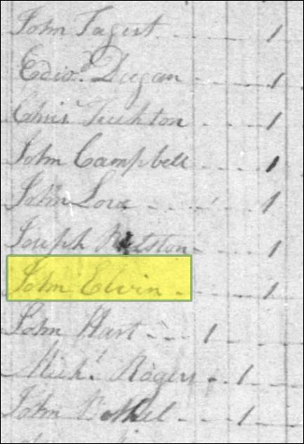 John Elbin (1)Õs name appears close to the Hall family (Elizabeth and Mary Hall both were head of household and both had slaves); it was thought he may have married a woman with the surname Hall.