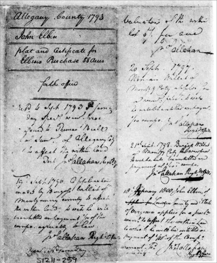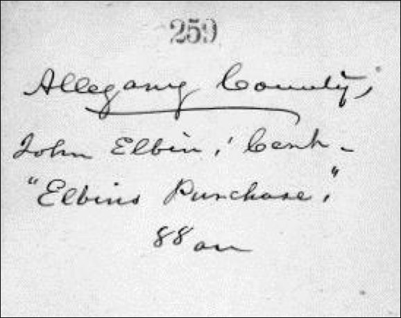 1788 -- John Elbin (1) was awarded Lot #3870 in Deakin's Survey in 1788; an area that would become Allegany Co., MD, by 1789. Most likely he had already lived on this land much earlier than 1788 when it was Washington County.