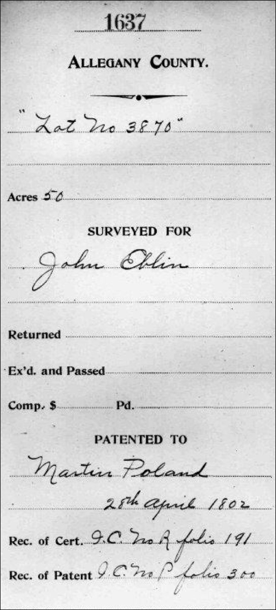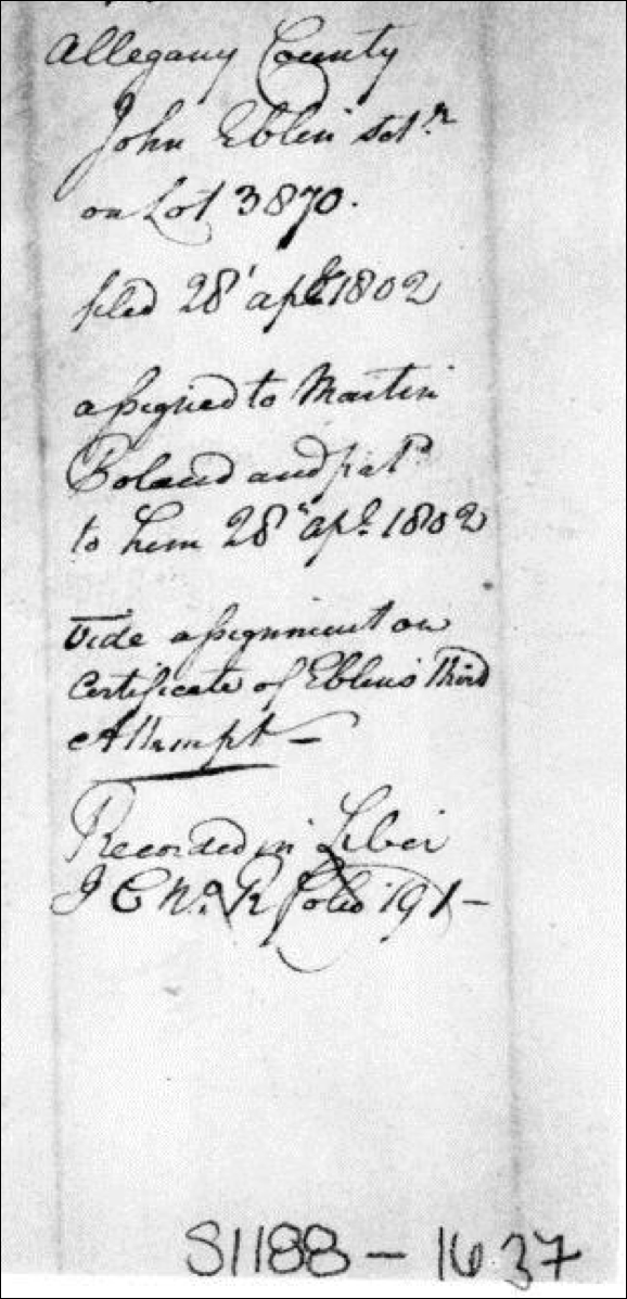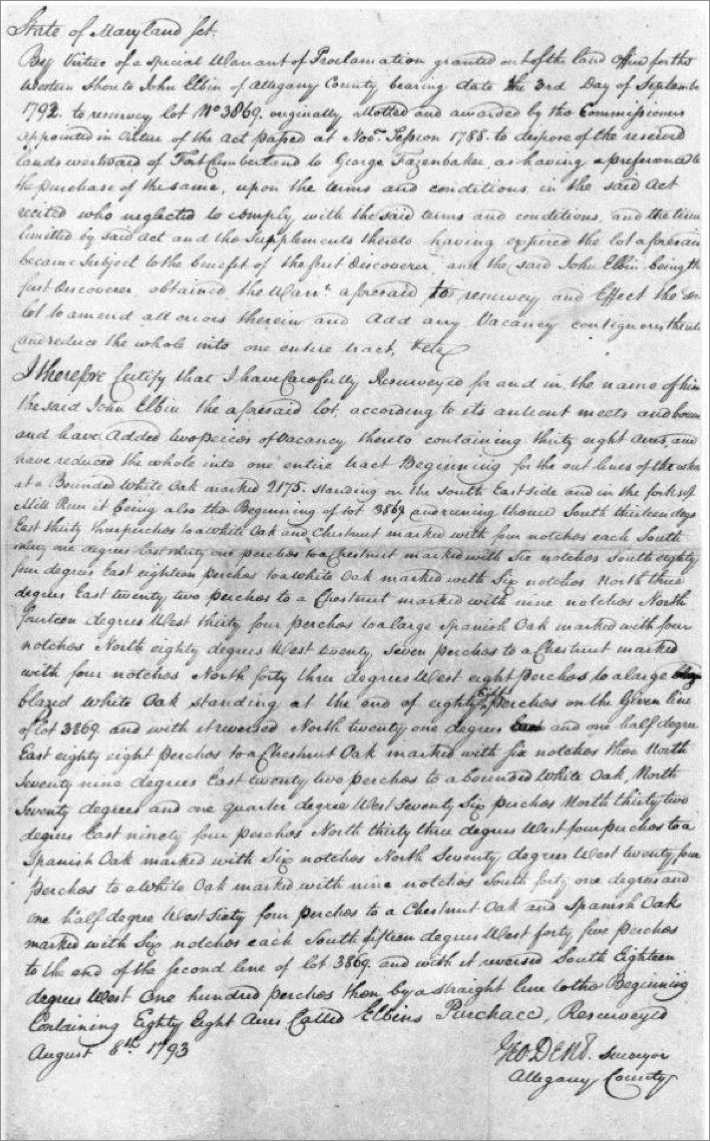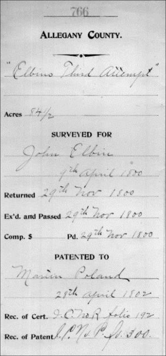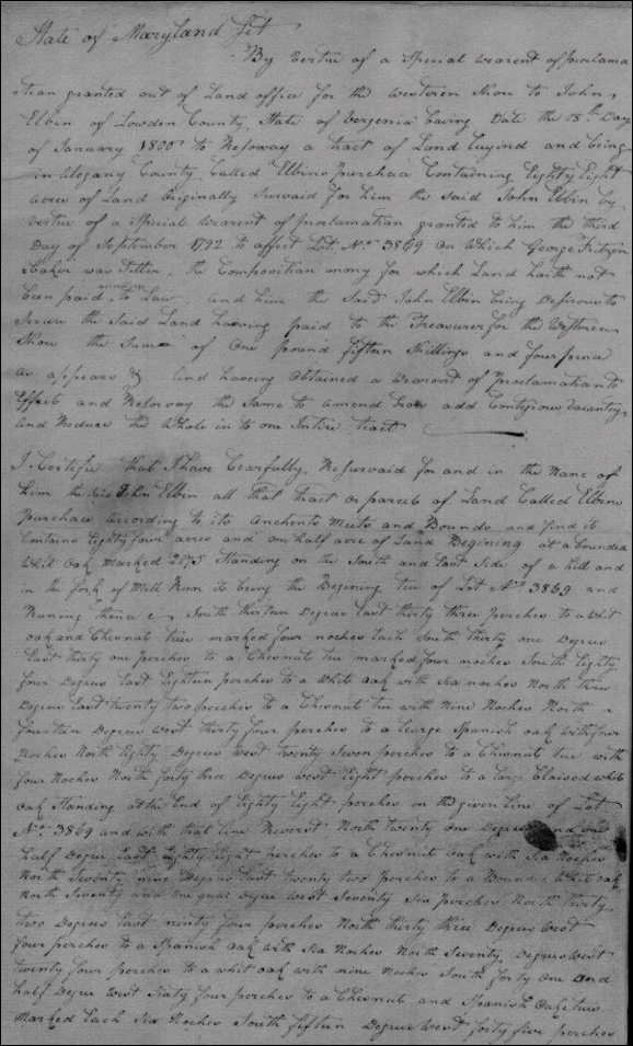 1792 -- State of Maryland, granted land on the Western Shore to John Elbin (1) of Allegany County on 3 Sep 1792, lot #3869, next to his current lot #3870. It contained 88 acres called ÒElbinÕs PurchaseÓ, bound to Thomas Beall of Allegany Co., MD. George Fazenbaker was disposing of his land westward of Fort Cumberland to John Elbin (1).