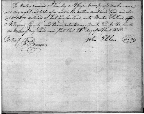 John ElbinÕs name appears on one deed showing his residence in Harford Co. and Allegany Co., MD. This is proof that this is the same John early on.