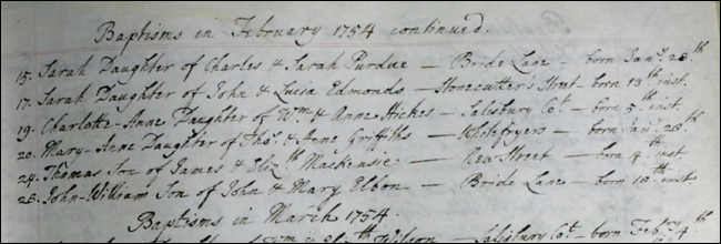 The following baptism record needs to be researched if is connected to this family. The dates, names, and place are perfect, as John was born ca. 1754/55, his mother could have been named Mary as he named his daughter Mary, and London could have been the port he left from to immigrate to America – this is all heresay. This reports states that John William Elbon was baptized 26 Feb 1754 at St. BrideÕs Parish on Fleet Street in London. No data shows that he remained in London or immigrated to America.