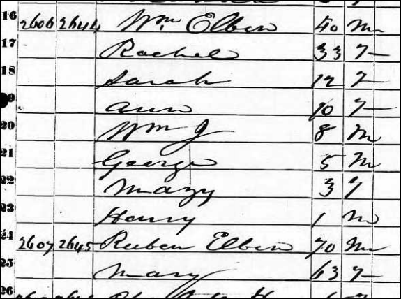 Mary Elbin, wife of Reuben Elbin, b. 1795 in MD, age 75, cannot read or write,