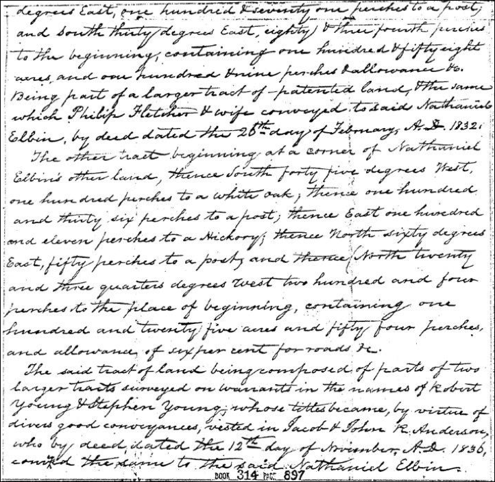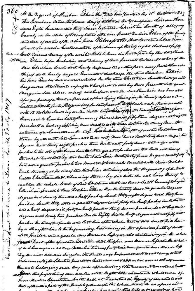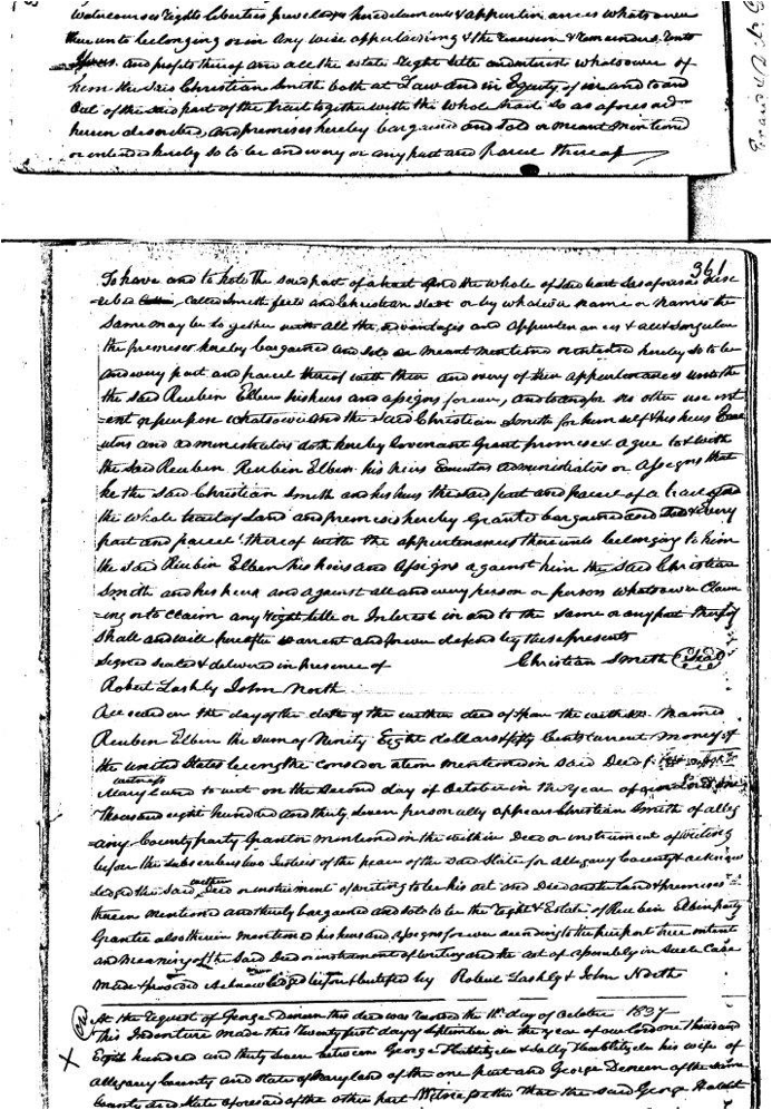 Land Deed recorded 11 Oct 1837, from Christian Smith to Reuben Elbin in Allegany Co., MD.