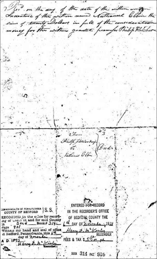 25 Jan 1841, Bedford Co., PA, Nathaniel ÒElvinÓ. Apparently Nathaniel remained in Bedford Co., PA, while his oldest brother John resided on their fatherÕs land in Allegany Co., MD. Nathaniel gives to Arnold Lashley, his son-in-law.