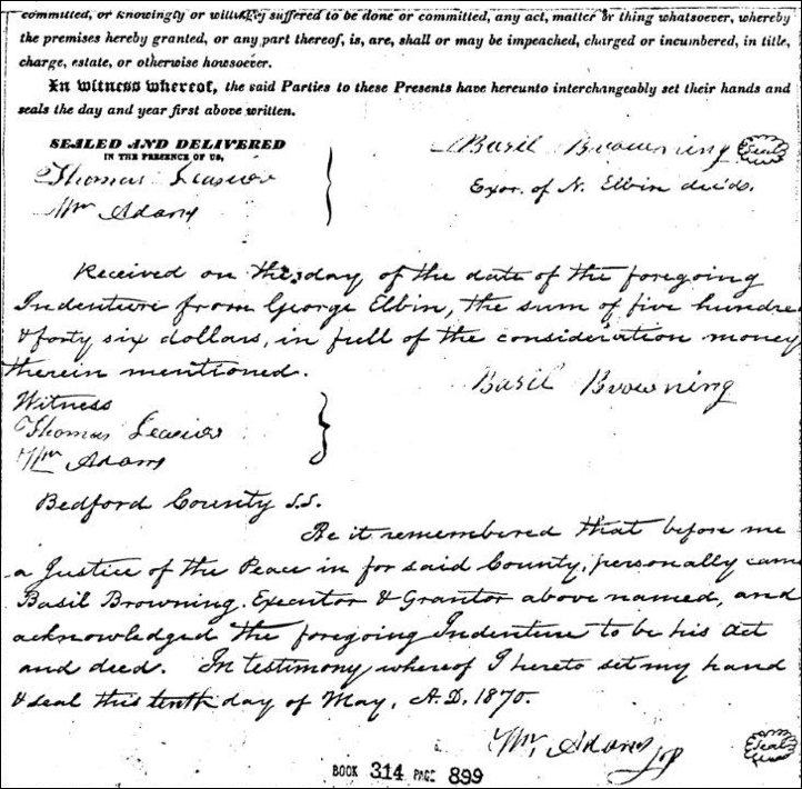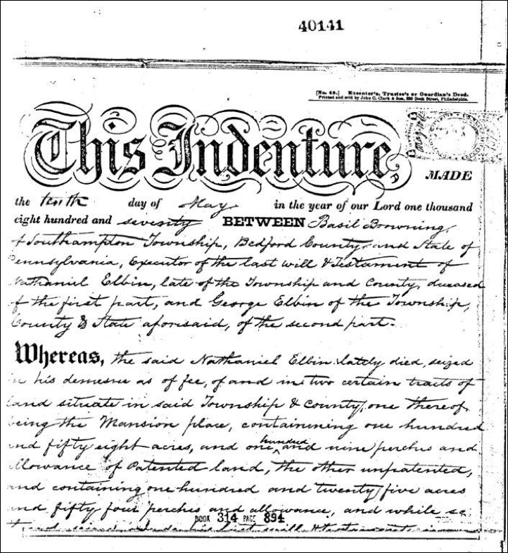 The Indenture dated 10 May 1870 between NathanielÕs executor Basil Browning of Southampton township, Bedford Co., and the state of Pennsylvania. Nathaniel had 2 tracts of land; one had 158 acres and 109 perches, and the other had 124 acres and 54 perches.