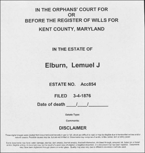 Maryland, Probate Estate and Guardianship Files, 1796-1940, probate dated 4 March 1876. He had his last son Charles Albert Elbourn in 1877, just 2 years before he died. LemuelÕs name in this document is spelled differently within the same document, e.g., Elburn, Elbern, Elbourn, and others.