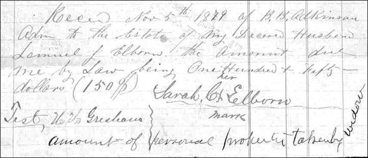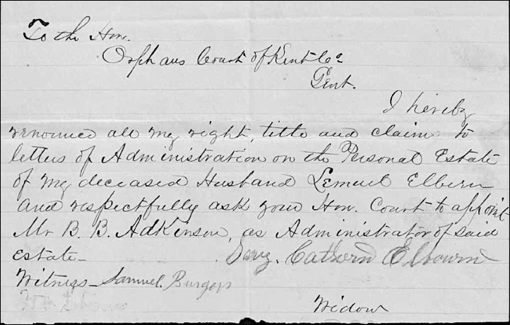 Because Lemuel died intestate, the administration fell to his wife (or eldest child Thomas) to be the Last Will and Testament of Lemuel. She renounced all her rights, title, and claim to letters of Administration on the Personal Estate of her deceased husband Lemuel Elbern, and respectfully asked the Honorable Court to appoint Mr. B. B. Adkinson as Administrator of said Estate, Catherine Elbourne signed with an X (as his wife) and Samuel Burgess and Richard Hynson were witnesses. The estate was taken to probate at the OrphansÕ Court.