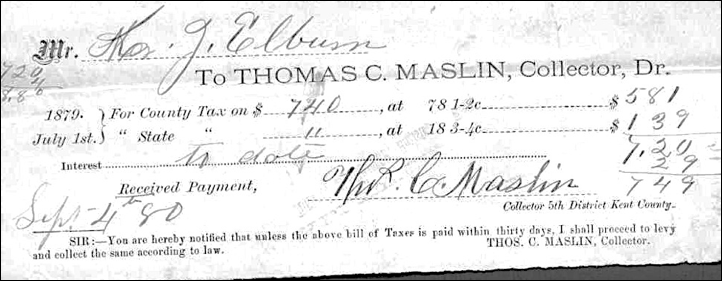 Thomas C. Maslin (below), a Tax Collector, collected taxes from Lem.? J. Elburn on 4 Sep 1880, in the 5th District of Kent County.