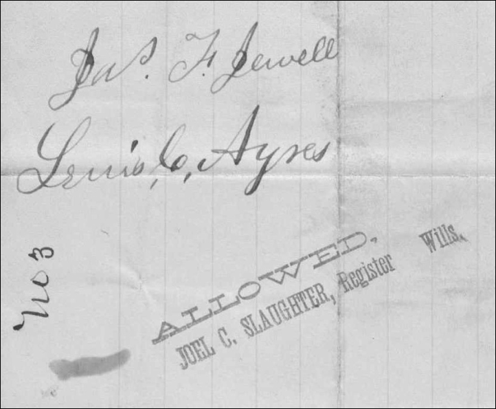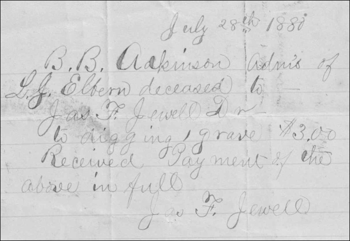 On page 14, the date shows 9 Nov 1880 and the widow is ÒSarah C. Elborn, widow of said deceasedÓ. LemuelÕs body was put in a coffin as per George Leary. Below his name also on page 14 is the name of James F. Jewell who framed the coffin and/or was the undertaker. The estate and disbursements were brought forward when paid or sold. Other names mentioned are Benedict B. Adkinson (Administrator of Lemuel), Samuel Burgess, Thomas H. Hague, J. Frank Wheatley, William Deihl, Harmon Taylor, James Pearce, Charles C. Stephens, William Stevens, Thomas C. Maslin, George Beck, and J. C. Slaughter.