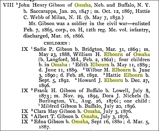 Research from Judy Elbourn Curtis: Sadie was b. 31 Mar 1869, Bridgeton, Cumberland, Maine, and she d. 14 Nov 1942, Lincoln, Lancaster, NE, dau. of John Henry Gibson (b. 20 Jan 1846, Saccarappa, Cumberland, ME, d. 16 Sep 1931, Buffalo, Erie, NY) and Harriet Cornelia Webb (b. 7 May 1852, Milan, Coos, NH, d. 10 Sep 1898, Buffalo, Erie, NY). She was the oldest of 5 children. Her father was a carriage maker and carpenter in Maine. The family moved to Omaha, Nebraska in abt. 1875 where the youngest 3 children were born. In Omaha, her father was an insurance and real estate broker. Sadie's parents moved to Buffalo, New York in the mid 1890's where her father became the general manager of the American Investor's Trust. Her mother, Hattie Webb died in 1898 in Buffalo. Her father then remarried and remained in Buffalo, New York, making occasional visits to Nebraska until he died in 1931. Sadie and her brother Frank were always close and were living in Omaha, Nebraska when she met and married William Elbourn. Sarah ÒSadieÓ Gibson's father, John Henry Gibson, was b. 20 Jan 1848 in Saccarappa (Westbrook), Cumberland, ME According to wikipedia, Bridgton & Westbrook are very close to each other. I know the family lived in Bridgton when Sadie was born (oldest child b. 31 Mar 1869); however, the puzzle is her brother Frank (8 Jul 1873, and the location I have is Lowell, Middlesex, MA----this is a head scratcher, as I do not know any family stories regarding living in MA.
