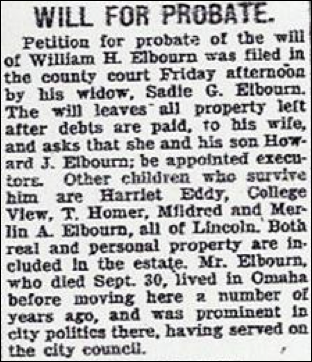 1920 census – William lived in Lincoln Ward 7, Lancaster, NE with his wife Sadie G. They are living with of their 3 children: Homer 19, Mildred 10, and Merlin A. 8, and 5 women, all teaching at the University of NE – Lincoln Agricultural College and boarding in the Elbourn home: Bernice Clay, Edna E. Noble, Matilda Peters, Elizabeth E. Rutherford, and Ruth Odell. During the 1920Õs, William acquired a drug store/grocery story combination on the corner of 33rd Street and Holdrege in Lincoln, NE. William also traveled and sold Hartford insurance to farmers across most of the state of Nebraska.