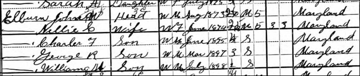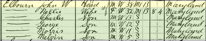 1880 census – William lived with the Tarbutton, Scott, and Johnson families in Edesville, Kent, MD, at age 17. The head of household was William J. Tarbutton 38, and his wife Mary A. Tarbutton 36. William Elbourn was a farm laborer.