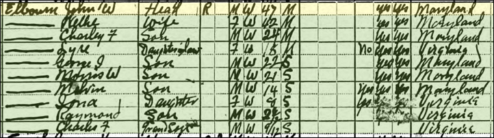 1940 census -- Edesville, Kent, MD, Joseph L. Elbourn is 78, living alone, b. ca. 1862, widowed, stating that both parents were born in MD. Ancestry.com has his middle initial indexed as ÒJÓ. He is living in Piney Neck where he owns his home and has completed the 3rd grade.