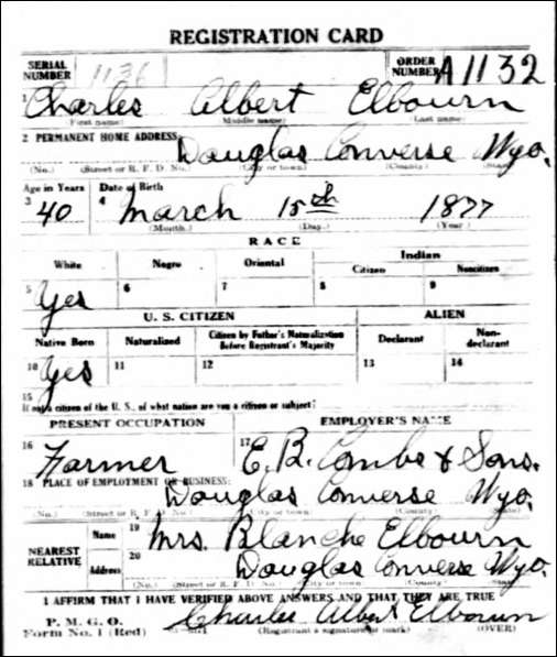 5.8* Charles Albert Elbourn (Elbourne), b. 19 Mar 1877, Rock Hall, Kent, MD, d. 9 Mar 1954, Salem, Kent, MO. He is buried at the Douglas Park Cemetery in Douglas, Converse, WY; there is no marker. Charles Albert Elbourn (Elbourne) and his descendants changed the spelling of Elbourn to Elbourne – reason unknown. Charles signed up for the WWI Draft in Converse, WY, at age 40. He was a farmer working for E. B. Combs & Sons. He was tall, slender, with grey eyes and light hair. He signed the Registration Card as ÒCharles Albert ElbournÓ.