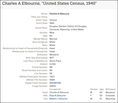 1940 census of Douglas, Converse, WY, Charles lived on Nuberill St. in the East end of town. He was a caretaker with an 8th grade education. He was living with his second wife Elsie A. Elbourne, 53, and their son Robert Leroy Elbourne, 12. Robert Leroy Elbourne was b. 17 Feb 1928 and died at age 12 on 14 Nov 1940, right after the census was taken.