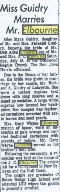 8.53* Don Allen Elbourne, b. 5 Aug 1948, Baton Rouge, Baton Rouge, LA, m. 22 Jul 1967, Myra Fernanda Guidry, b. 15 Aug 1948, Abbeville, Vermilion Parish, LA, dau. of Fernanda Lawrence Guidry & Delores Ann Fornier.
