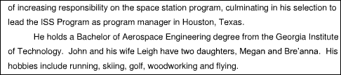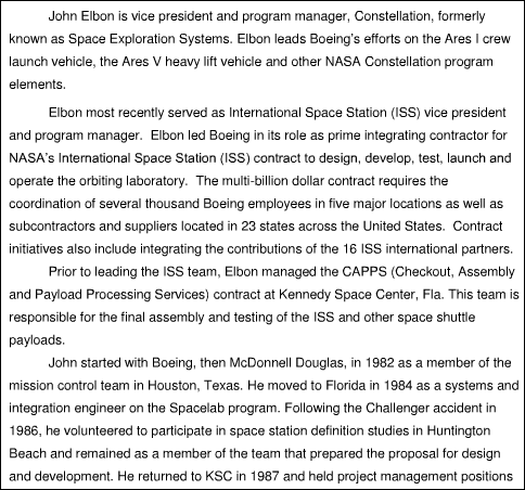 See: http://www.docstoc.com/docs/30473290/John-Elbon---American-Institute-of-Aeronautics-and-Astronautics. Also see http://www.jsc.nasa.gov/jscfeatures/articles/000000459.html.
